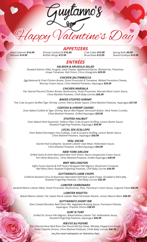 Guytanno’s will now be requiring a Credit Card Deposit on all reservations of six people or more. There will be a $10 per person charge. Upon your arrival, the Credit Card Deposit will be credited. If the reservation is cancelled within 4 hours of your scheduled reservation, the Credit Card Deposit will be forfeited.